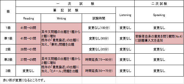 さて、1月20日に今年度第3回の英検があります。その後2024年度第1回の英検より、1級から3級の試験内容が大幅に変更になります。問題数変更や試験時間が増える級がありますので、英検受験を考えている方は下の表をよく見ておいてください。
